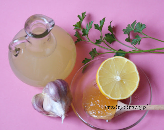 2 główki czosnku1/4 szklanki soku z cytryny2-3 łyżeczki miodu1 szklanka ciepłej, przegotowanej wody