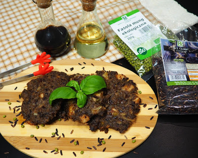 PLACKI Z FASOLI MUNG I CZARNEGO RYŻU Z KURCZAKIEM