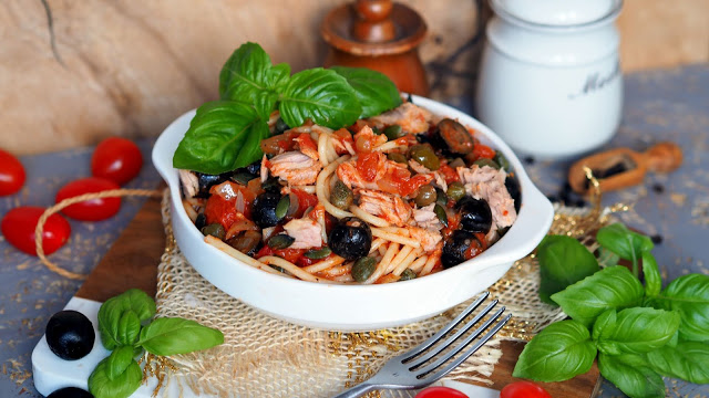 Z makaronu zawsze można przygotować pyszne danie w kilka chwil. Wystarczy otworzyć szafkę albo lodówkę i na pewno znajdą się jakieś składniki, które można do niego dodać. Tym razem spaghetti z tuńczykiem, oliwkami i ulubionymi przez mojego Smakosza kaparami. Do tego są jeszcze oliwki, które są u