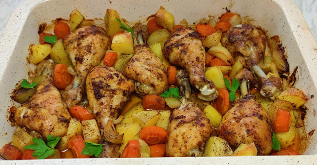 Ziemniaki 4Marchewka 2Czosnek 3 ząbkiOlej 4 łyżkiPapryka słodka łyżeczkaPieprz paska łyżeczkaSól łyżkaMajeranek łyżeczkaPrzygotowanie: