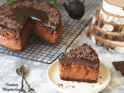 Czekoladowy sernik na zimno z musem z suszonych śliwek oraz czekoladową chrupką z płatków kukurydzianych. Pyszne ciasto bez pieczenia, przygotowane na spodzie herbatnikowym, z czekoladową masą serową z serka mascarpone i gorzkiej czekolady. Wierzch ciasta zdobi polewa z czekolady gorzkiej oraz mlecznej.