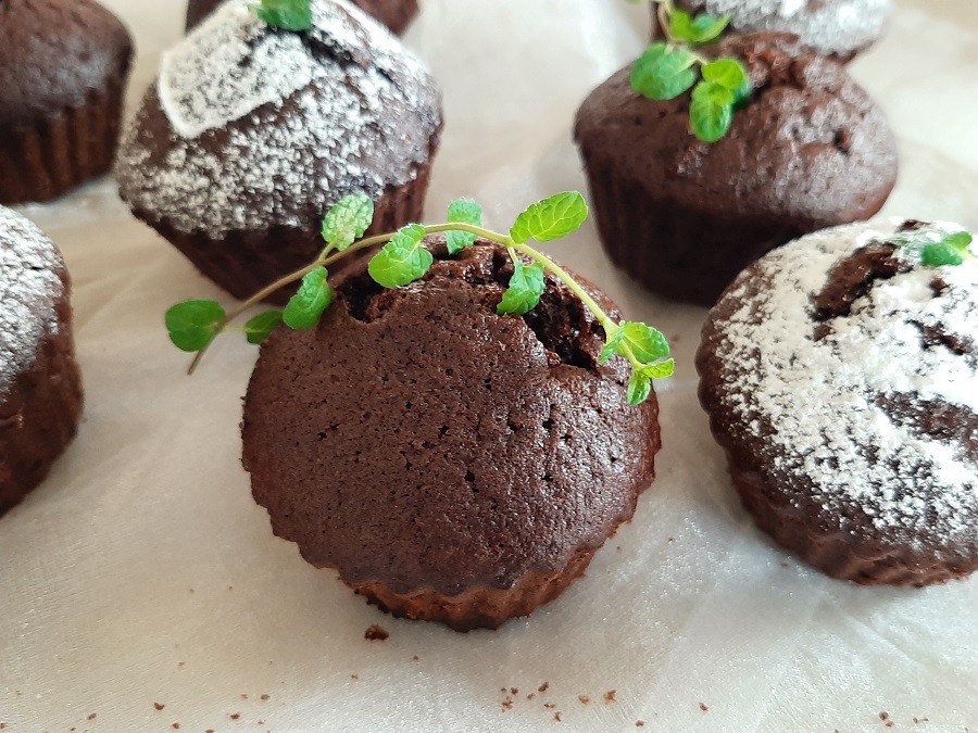 Czekoladowe muffiny z delikatną nutką mięty są zaskakująco pyszne. Smakują zarówno dzieciom, jak i dorosłym. Dzięki miętowym czekoladkom babeczki są rześkie i słodkie zarazem. Przystrojone listkami świeżej mięty ładnie prezentują się na stole 🙂