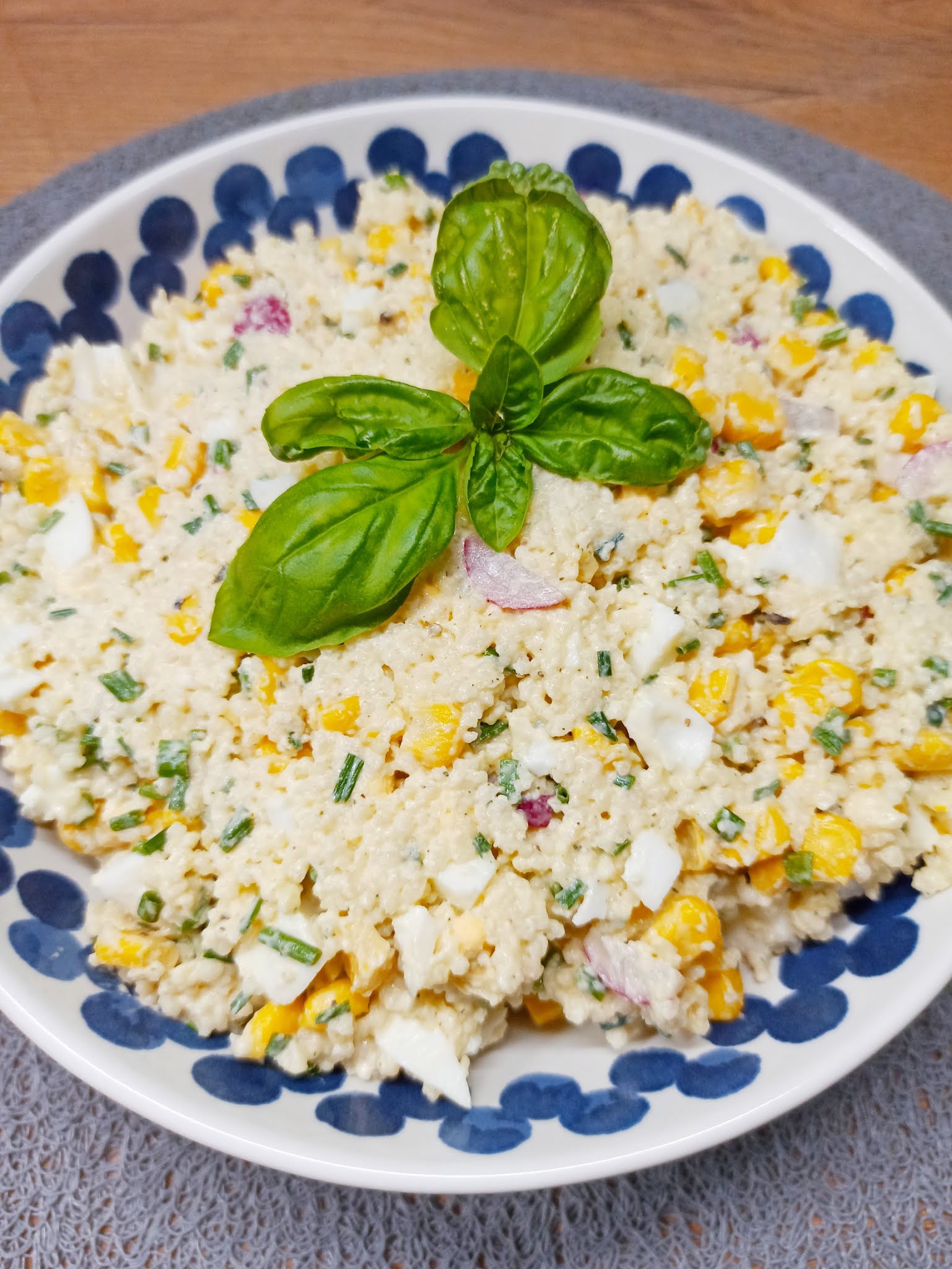 1 szklanka kaszy kuskus4 jajka ugotowane na twardo8-10 małych rzodkiewekpęczek szczypiorku1 puszka kukurydzy (masa po odsączeniu: okolo 200 g)3 łyżki