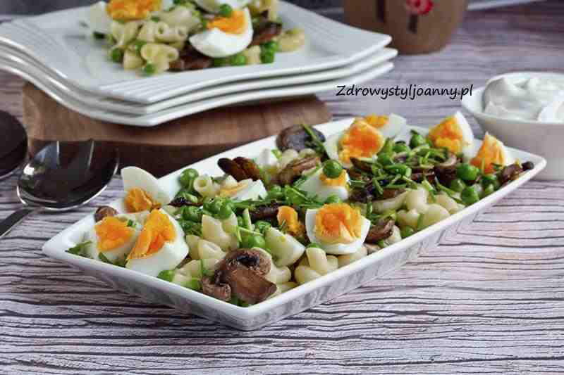 Sałatka z makaronem i jajkiem. Jest to łatwy przepis na sałatkę z jajkami, makaronem, pieczarkami i groszkiem z dodatkiem jogurtu greckiego. Ta