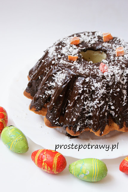 4 jajka20 dag mąki ziemniaczanej i tyle samo maki pszennej20 dag masła200 ml mleka1 łyżeczka proszku do pieczenia2 łyżki kakaopolewa czekoladowa, wiórki kokosowe