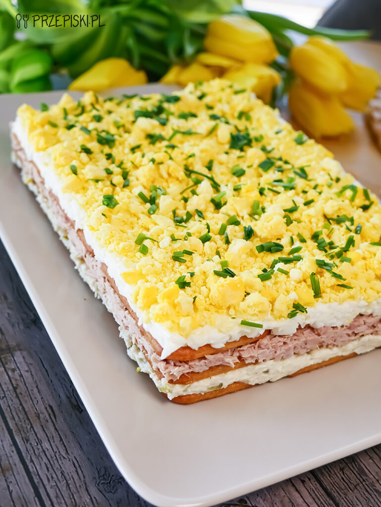 Warstwowa sałatka na krakersach to idealna opcja na święta i inne domowe imprezy. Sałatka wygląda jak ciasto, dzięki czemu świetnie prezentuje się na stole, a dodatkowo smakuje rewelacyjnie.