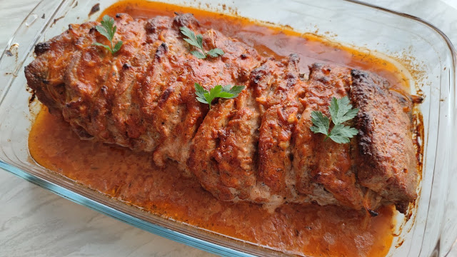Karkówka 1 kgKetchup 200 g ok 3/4 szklankiMajonez 3 łyżkiMusztarda łyżkaPrzyprawa kebab gyros małe opakowanieCebula 3Czosnek 3 ząbkiPieprz łyżeczka płaskaSól łyżeczkaPrzygotowanie: