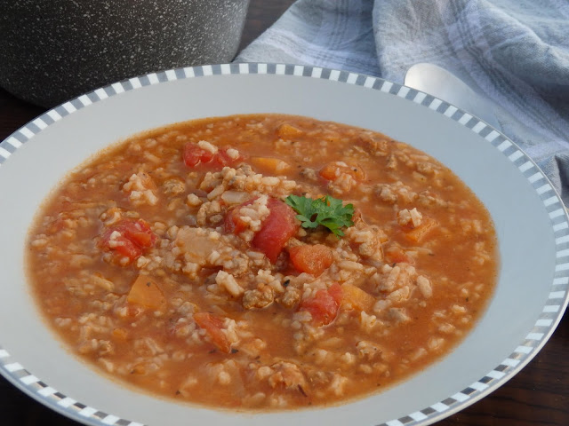 Do wykorzystania miałam mięso mielone z łopatki. Nie miałam konkretnego pomysłu więc jak zwykle namieszałam coś z tego co było pod ręką. Do mięsa dodałam warzywa, ryż oraz pomidorowe przetwory. Doprawiłam solidnie wędzoną papryką oraz niewielką ilością oregano. I tak powstał mi gar gęstej i pożywnej zupy. Jak zupa ma