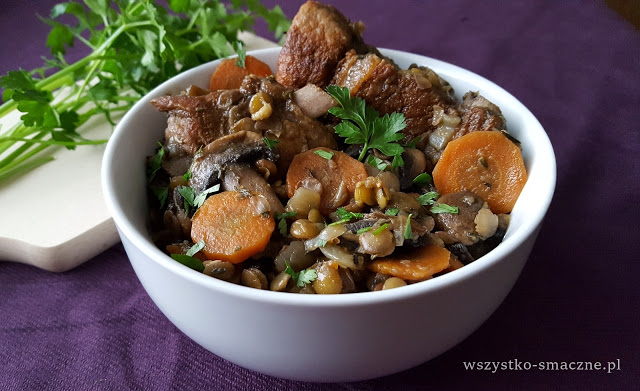 Żeberka z pieczarkami i zieloną soczewicą, a także tymiankiem i natką pietruszki…