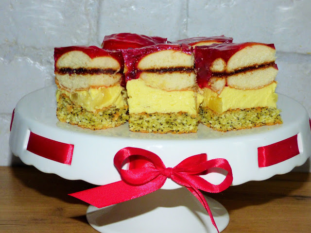 Kokosowo makowy biszkopt z kremem ananasowym, biszkoptami i galaretką. Składniki blaszka 23/33):ciasto:białka…