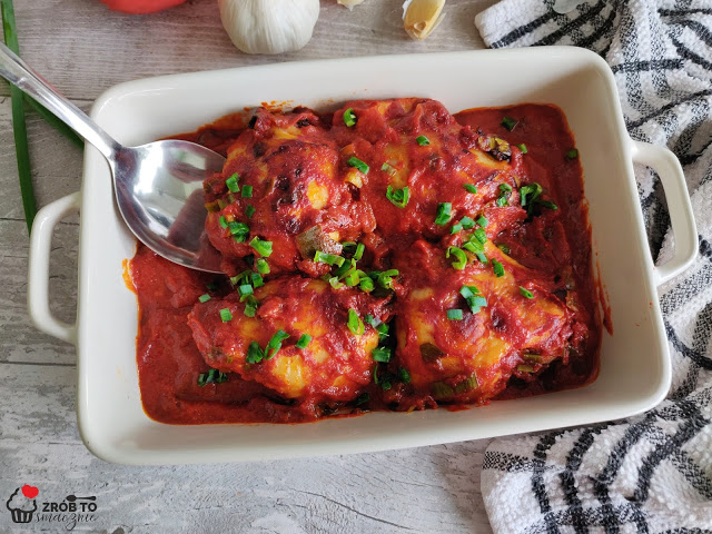 PIECZONE KAWAŁKI KURCZAKA Z POREM W SOSIE POMIDOROWYM