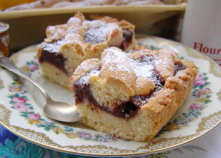 Składniki:palma 250 gram, cukier 1/2 szklanki, aromat rumowy 2 krople, jajko 1 sztuka „L”, proszek do pieczenia 1 łyżeczka, mąka tortowa 1 szklanka, mąka krupczatka 2 szklanki, dżem 500 gram, kisiel wiśniowy 1 opakowanie, cukier puder – ile potrzeba