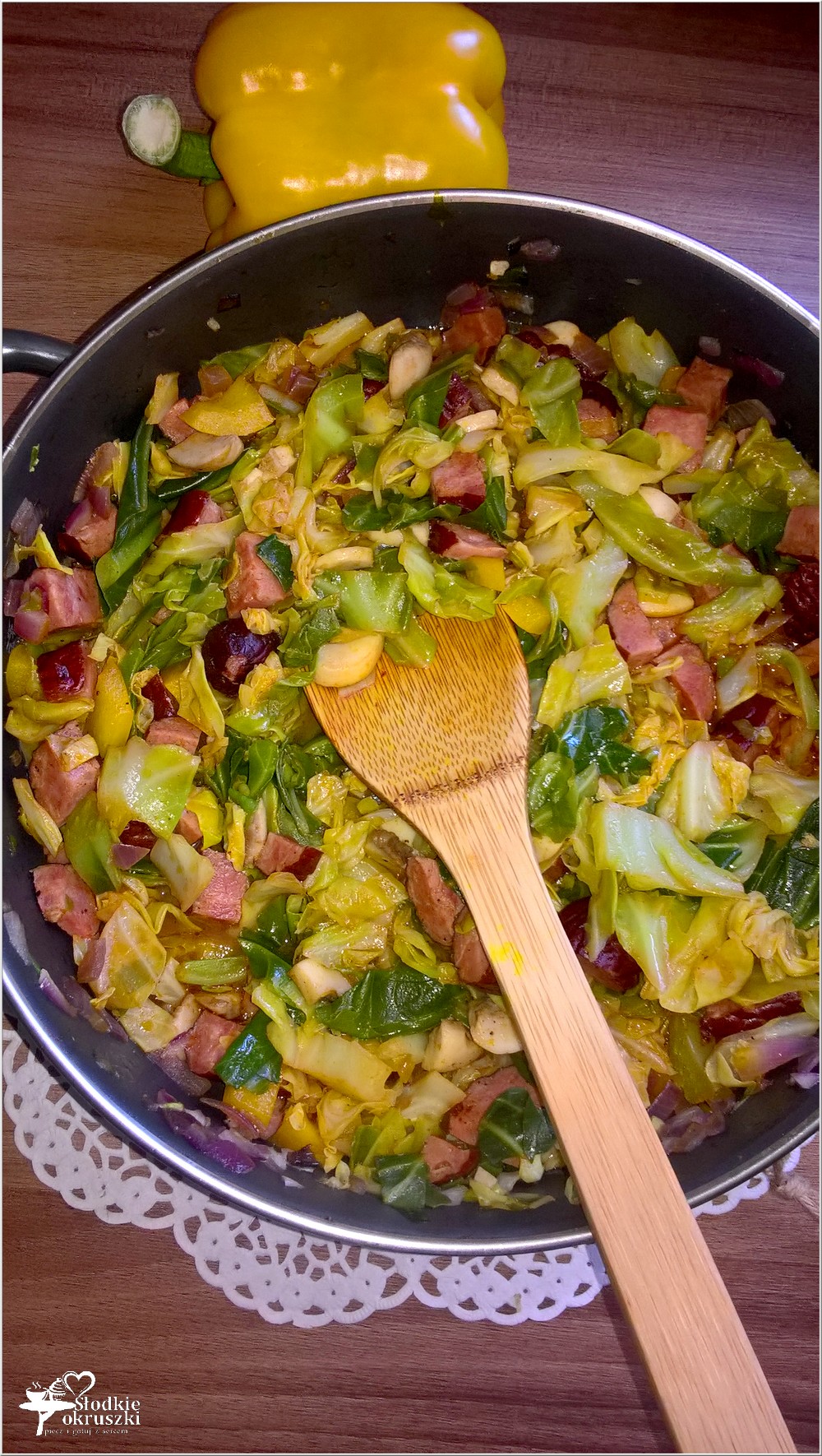 Młoda kapustka z kiełbasą jałowcową, papryką i pieczarkami