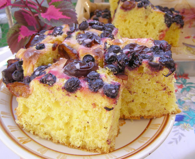 Składniki:drożdże świeże 7 dag, cukier 1 szklanka, mleko letnie 1,5 szklanki, palma 100 gram stopiona, aromat waniliowy 3 krople, jajka 1 sztuka „L”, żółtka 3 sztuki „L”, mąka tortowa 60 dag, sól 1 szczypta, kurkuma 2 łyżeczki, borówki 500 gram, cukier puder 1 szklanka, sok z cytryny 1 łyżeczka, gorąca