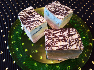 3 opakowania śmietanki 30% (1 opakowanie 330 ml)2 opakowania galaretki o smaku truskawkowym2 opakowania galaretki o smaku gruszkowym2 opakowania galaretki o smaku borówkowym1 opakowanie suchych wafli kwadratowych3 kubki gorącej wody każdy po 500 ml8 tabliczek (ok. 50 g) gorzkiej czekolady rozpuszczonej w kąpieli wodnejPrzygotowanie:I pianka (truskawkowa)2 opakowania galaretki truskawkowej rozpuścić