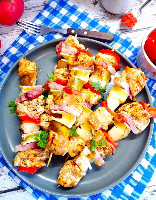 10 szaszłykówokoło 1 kg filetów z kurczakaokoło 400 gramów wędzonego boczku2 serki camembert2-3 gruszki1 papryka czerwonaPrzyprawa do kurczakaolej
