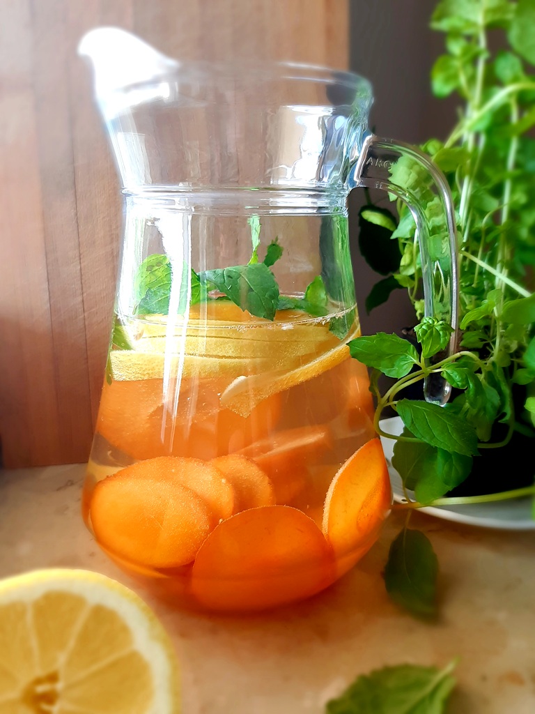 W upalne dni polecam domowe wody smakowe, czyli zdrowie 2 w 1 (woda + owoce). Dodają orzeźwienia, nawadniają organizm, działają cudownie na naszą skórę. Woda smakowa to tylko kilka podstawowych składników: woda, owoce, dla orzeźwienia cytrusy i listki świeżej mięty. Bez barwników, aromatów, zbędnych cukrów. Woda morelowo-imbirowa smakuje obłędnie, dodaje