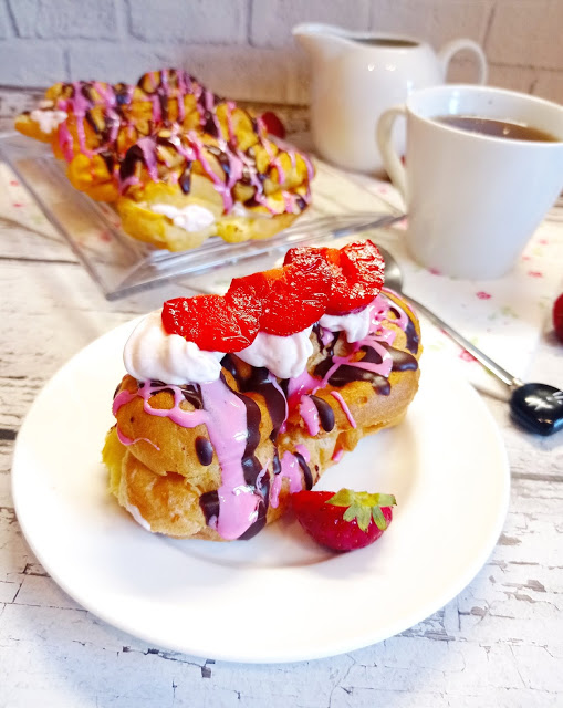 10 eklerów1 szklanka wody1 szklanka mąki pszennej130 gramów masła lub margaryny1 łyżeczka proszku do pieczeniaszczypta soli4 jajkakrem truskawkowy150 gramów truskawek250 gramów serka mascarpone100 ml. słodkiej śmietanki minimum 30 %2 łyżki cukru pudru1 płaska łyżka żelatyny