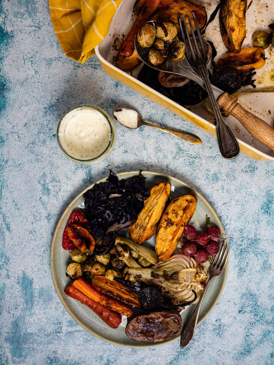 Pieczone warzywa z jogurtowym mojo verde