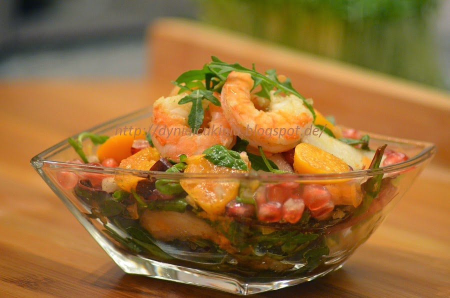 Składniki: kilka krewetek gotowanych na parzemix sałat garść rukoli ćwiartka gruszki kilka…