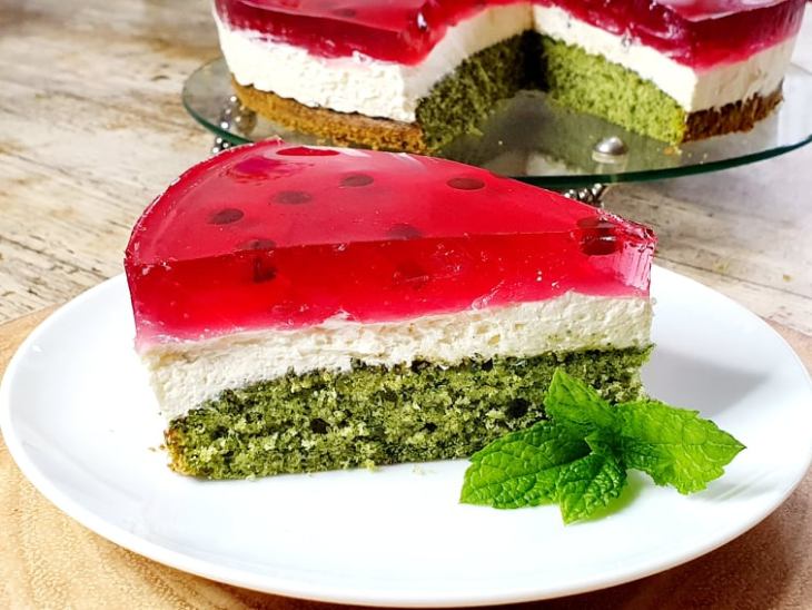 Przepis na pyszne, łatwe do zrobienia i pomysłowe ciasto arbuz. Idealne na letnie przyjęcia i spotkania przy kawie. Ciasto arbuz to szpinakowe ciasto z masą serkowo – śmietanową i galaretką, w moim wypadku jest to galaretka z owoców leśnych.