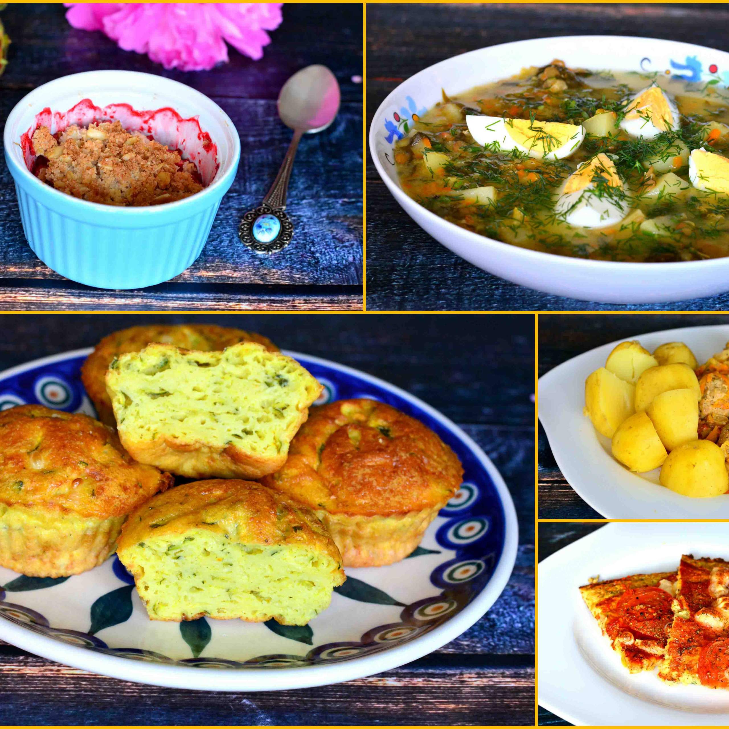 Rabarbar z truskawkami pod kruszonką. Szczawiowa z jajkiem. Muffinki cukiniowe. Pulpeciki w młodej kapuście. Pizza z kalafiora. Wszystkie przepisy pochodzą z książki „Fit przepisy Baletnicy. Sezonowo„