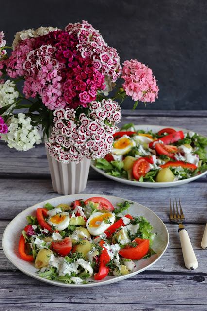 Sałatka z młodymi ziemniakami i jajkiem, to propozycja na pyszny, letni obiad. Jest sycąca i smaczna. Jajko z powodzeniem zastąpi mięso. Warto korzystać z młodych zimniaków, bo nadają potrawą ciekawego smaku. Takich wersji sałatki z ziemniakami można zrobić więcej. Pomidor można zastąpić ogórkami gruntowymi, a w jeszcze