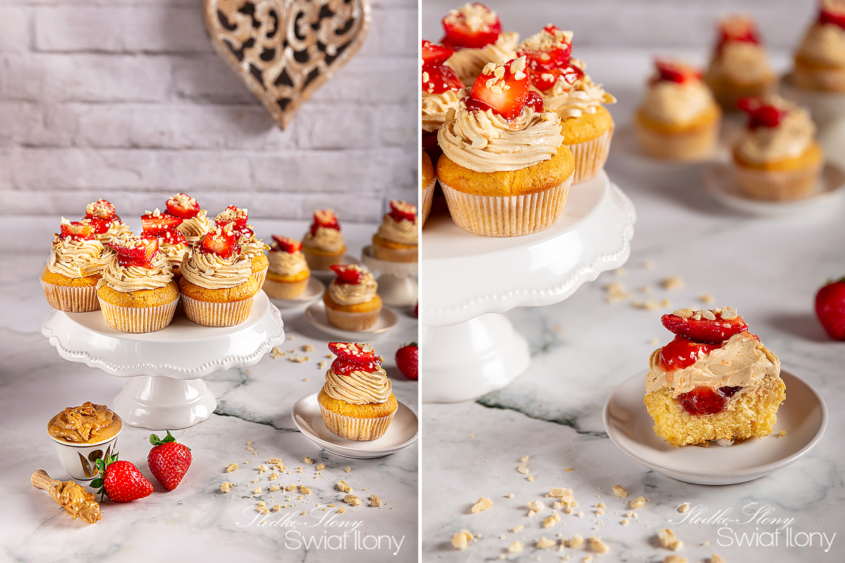 Na nadchodzący weekend mam dla Was fajny przepis na pyszne babeczki orzechowo – truskawkowe… Babeczki są mięciutkie i puszyste, nadziane po upieczeniu dżemem truskawkowym. Krem natomiast jest cięższy, maślany i orzechowy, zwieńczony kolejną, malutką porcją dżemu i soczystymi, słodkimi truskawkami.