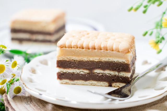 Bardzo proste i pyszne ciasto które nie potrzebuje piekarnika, a jedynie lodówki do jego schłodzenia.Warstwa ciemna to coś na kształt czekoladowych trufli z nuta chałwy (zwłaszcza jak nasączymy herbatniki wódką;) natomiast jasna masa to budyń waniliowy.