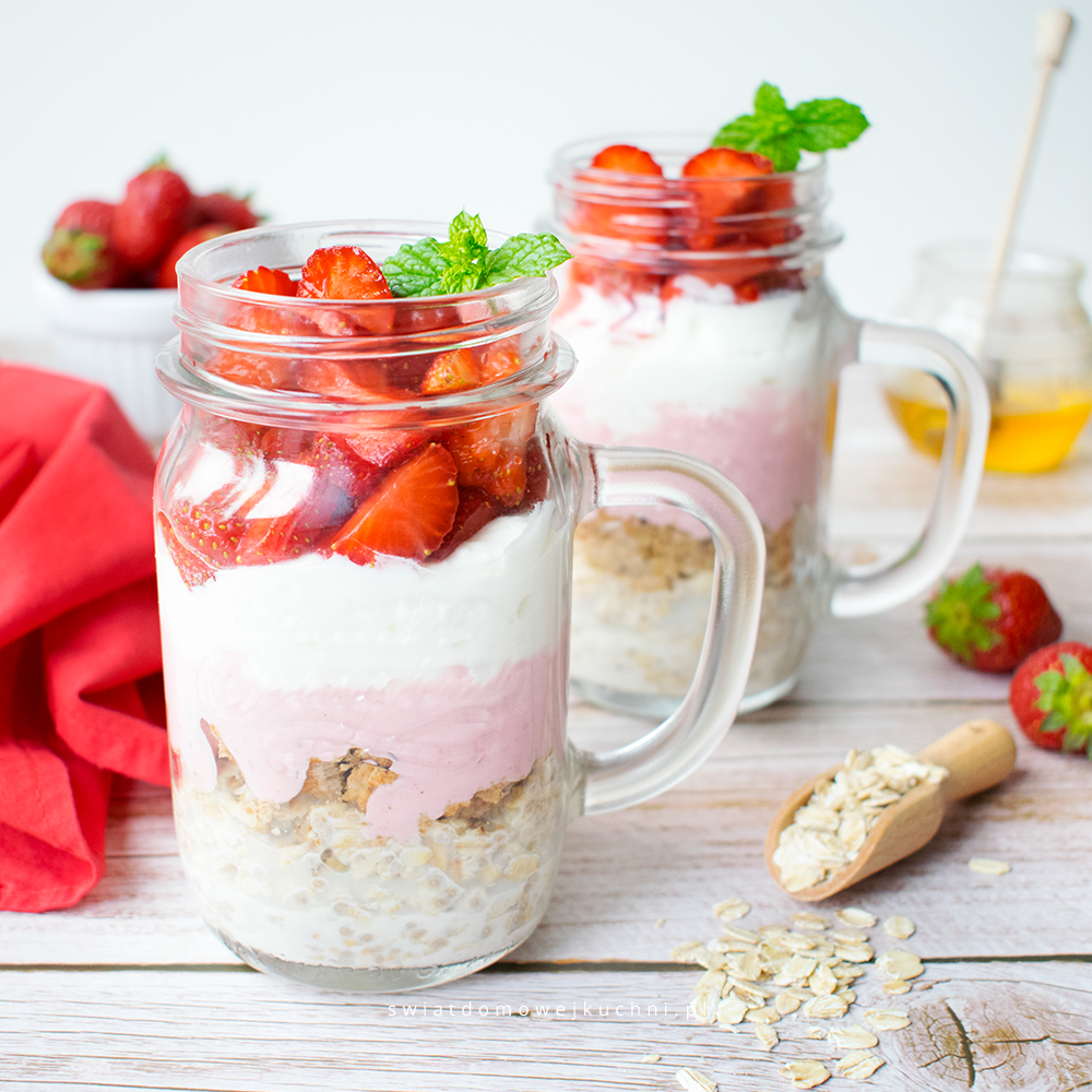 Nocna owsianka z jogurtem i truskawkami – to pyszne i zdrowe śniadanie zamknięte w jednym słoiczku. dzięki takiemu rozwiązaniu zyskujesz rano sporo czasu, a gotowy zestaw możesz zabrać ze sobą do pracy lub spakować dzieciom do szkoły. Wystarczy poprzedniego dnia, wieczorem, przygotować wszystkie składniki, ułożyć je warstwami, wstawić do lodówki
