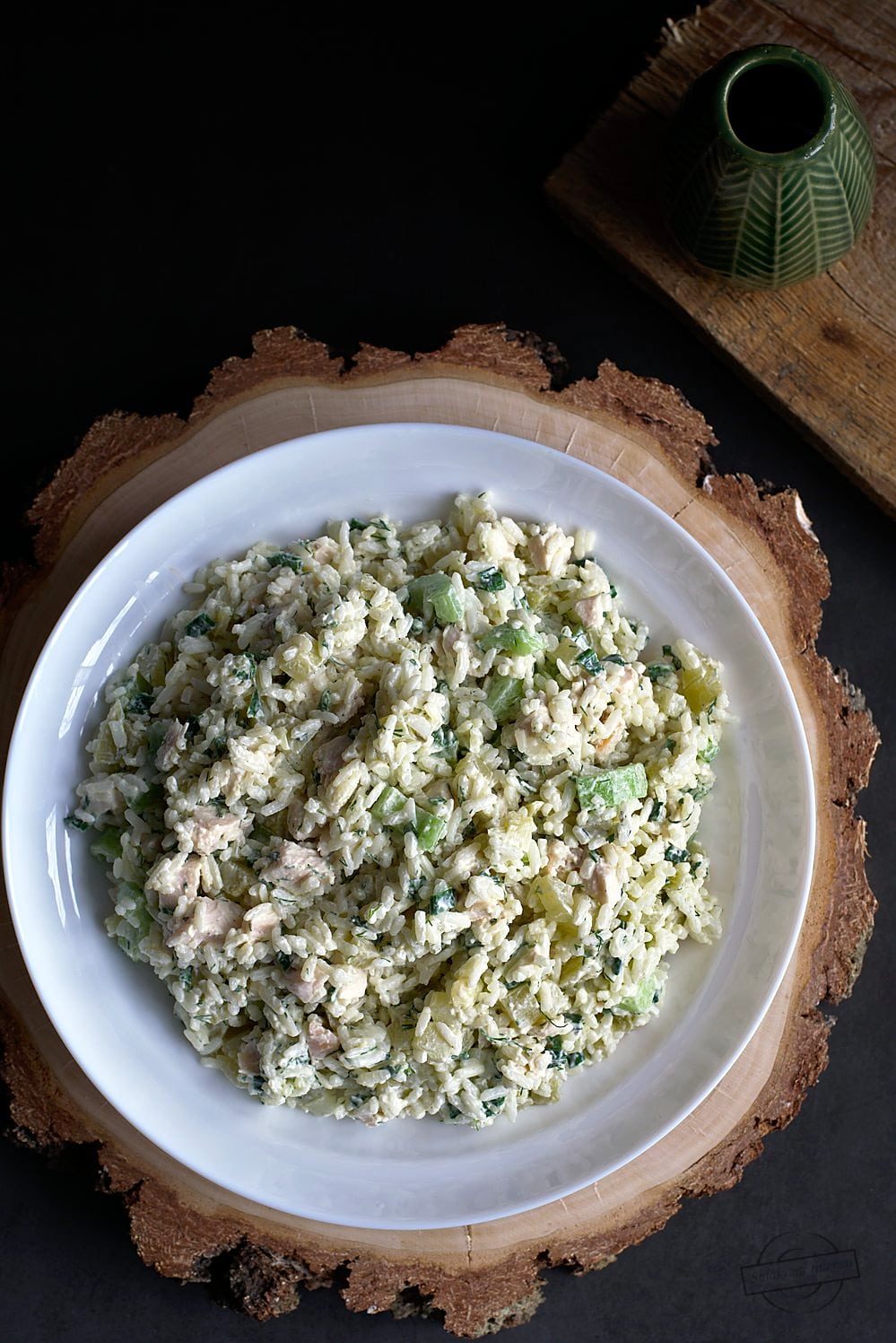 Wyrazista w smaku, głównie za sprawą kiszonych ogórków, sałatka ryżowa z wędzonym kurczakiem i dużą ilością zieleniny.