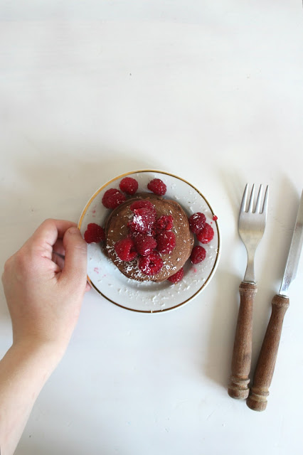 czekoladowe pancakes (placki) a la brownie podane z malinami i wiórkami kokosowymi…