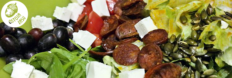 Składniki:kiełbasa chorizowinogrona bezpestkoweser fetaszpinak „baby”pestki z dynisałata lodowapomidor malinowy Przygotowanie:Kiełbasę podsmażyć na…