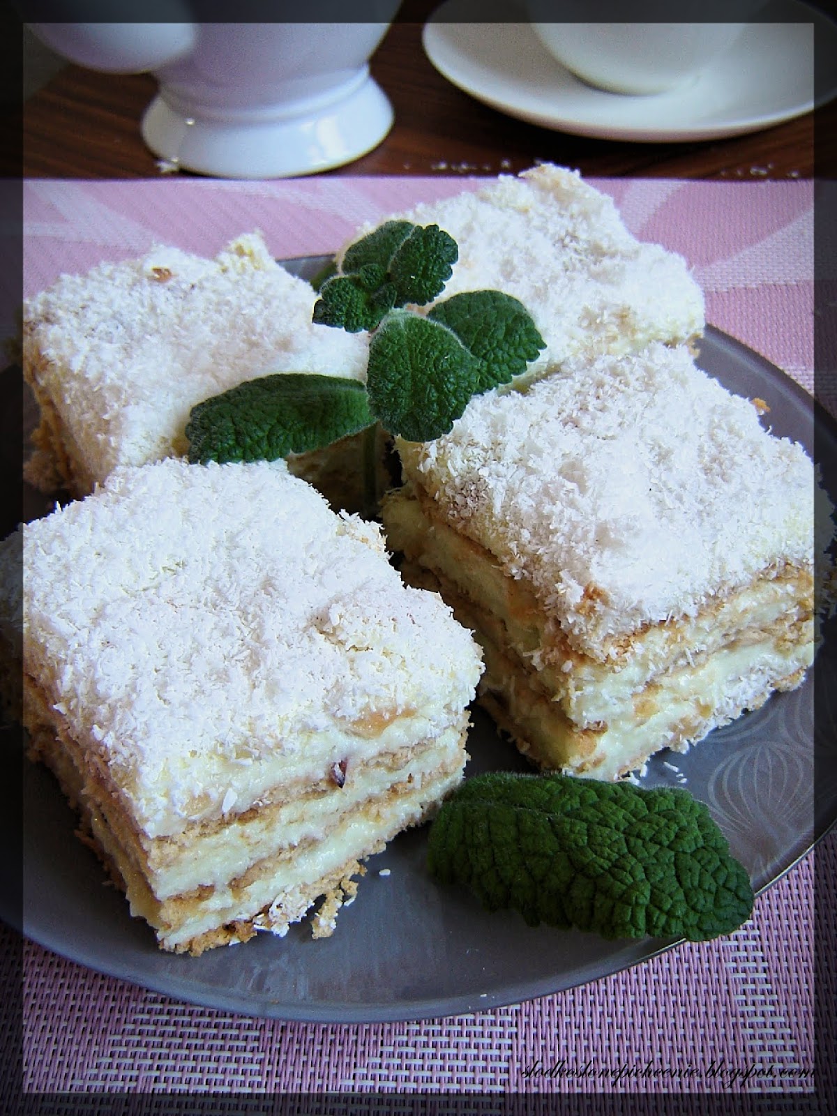 Smakowite ciasto bez pieczenia, przygotowane na herbatnikach, przełożonych kokosowym kremem budyniowym z…