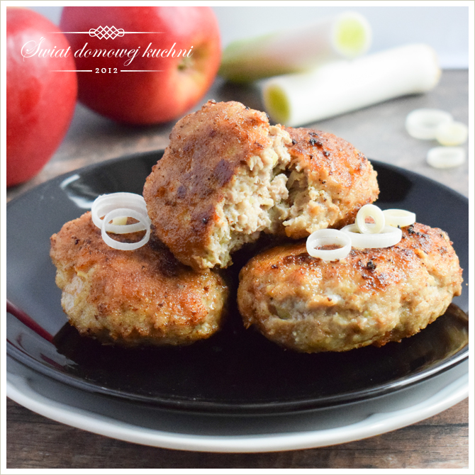 600 g mielonej łopatki wieprzowej,2 niezbyt duże jabłka,1 mały por (lub połowa…