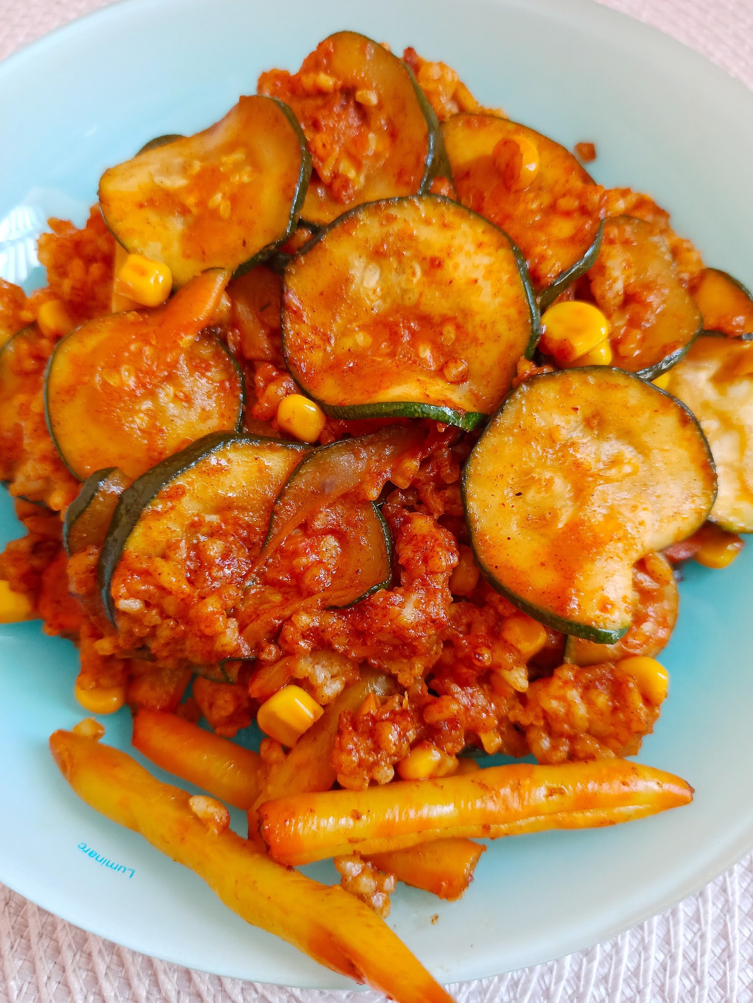 Ekspresowy i pyszny ryż z dodatkiem cukinii, marchewki, fasolki szparagowej i kukurydzy, którego przygotowanie zajmuje nie dłużej niż 30 minut.