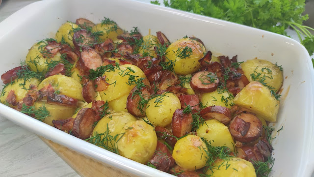 Ziemniaki 1kgKiełbasa 400 gBoczek wędzony 200 gŚmietana 200 mlJajka 2SólPieprzKoperek 1/2 pęczkaPrzygotowanie: