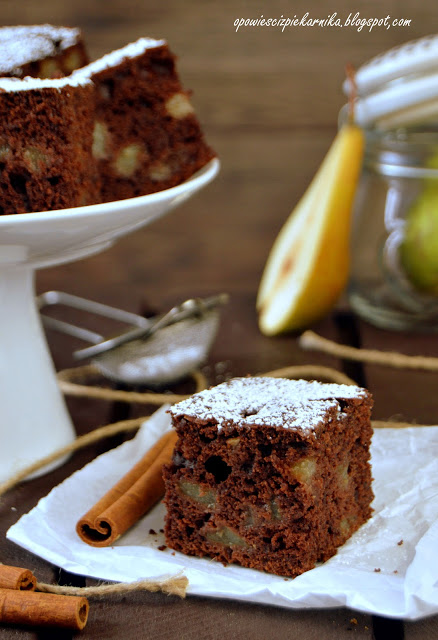 Mocno czekoladowe i bardzo puszyste ciasto z dodatkiem cynamonu i soczystych gruszek…