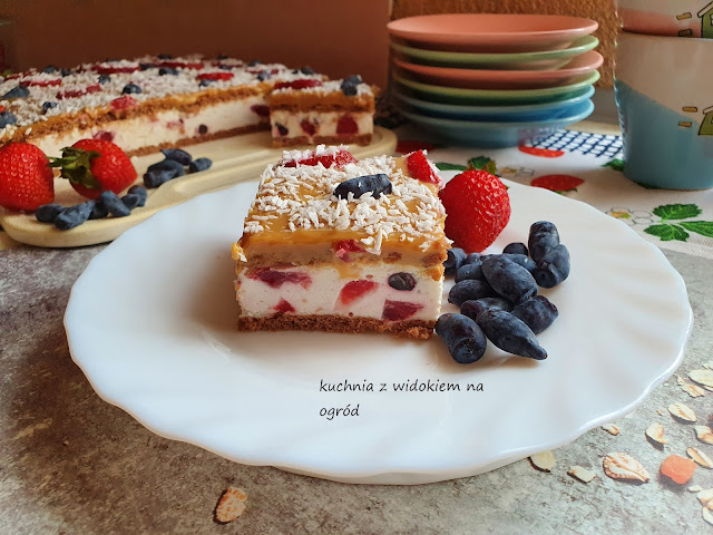 Na blogu już jest krówka kokosowa, którą wymyśliłam jakiś czas temu i wszystkim bardzo posmakowała. Teraz przyszedł czas na krówkę truskawkowo jagodową, którą stworzyłam niedawno. Ciasto na zimno, bez pieczenia, na herbatnikach. Błyskawiczne i bardzo proste w wykonaniu. Doskonała propozycja na lato i wakacje. Polecam 🙂