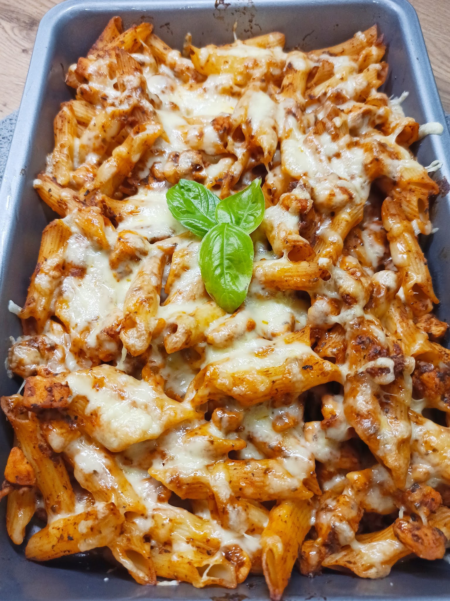 Pyszna zapiekanka makaronowa z kurczakiem i sosem pomidorowym. To idealna propozycja na kolację! 🙂