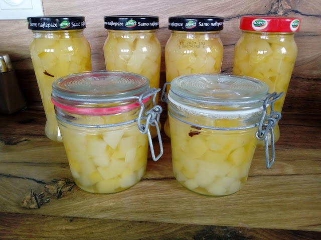 Dziś z samego rana zrobiłam kolejną porcję tak zwanych ananasków z cukinii. Dwa dni temu tez robiłam podobne, ale trochę inną metodą i bez goździków. Tym razem zrobiłam ananaski na drugi sposób. Niedługo chyba cukinia będzie mi się śniła po nocach, bo robię z niej przetwory co