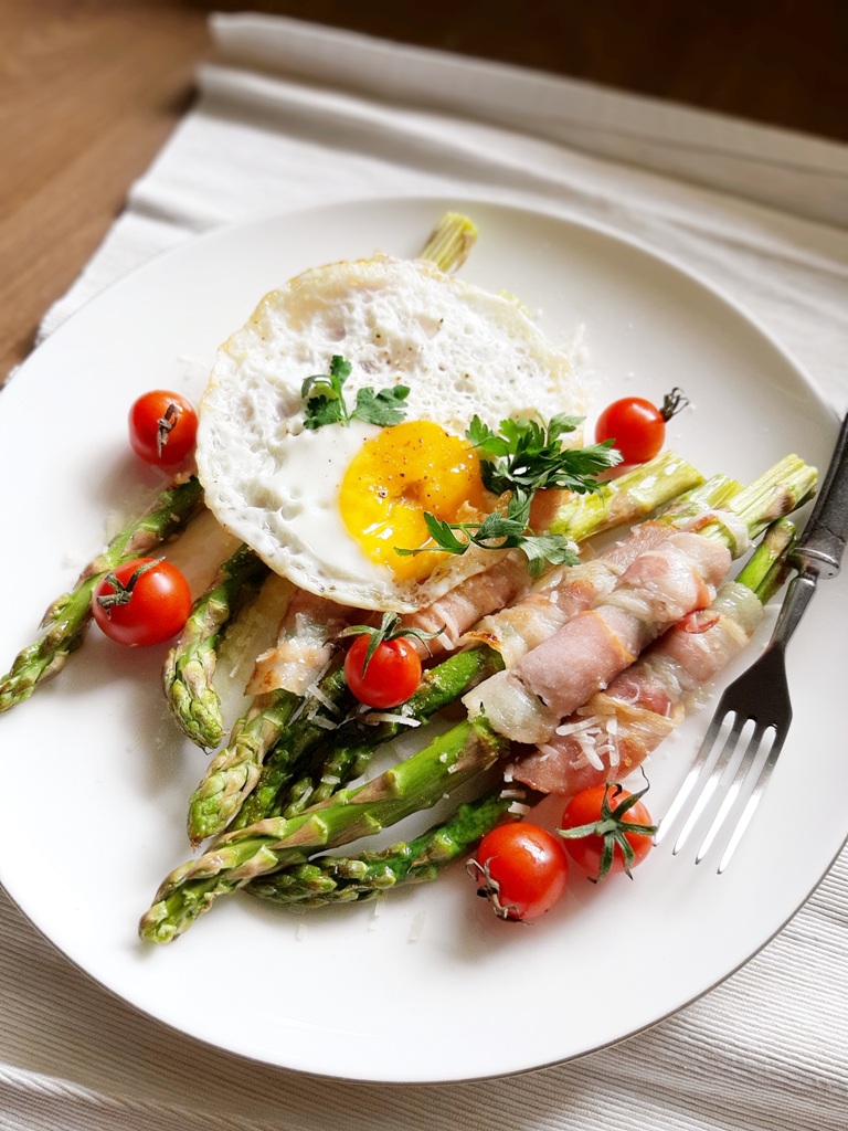 Szparagi owinięte boczkiem z dodatkiem parmezanu to świetny, sezonowy pomysł na drugie, ciepłe śniadanie lub podwieczorek. Szparagi z boczkiem podaję także jako przystawkę lub przekąskę w ciągu dnia. Świetnymi dodatkami będą domowe, aromatyczne grzanki maślane lub z dodatkiem czosnku oraz jajko sadzone. Poniżej dokładny