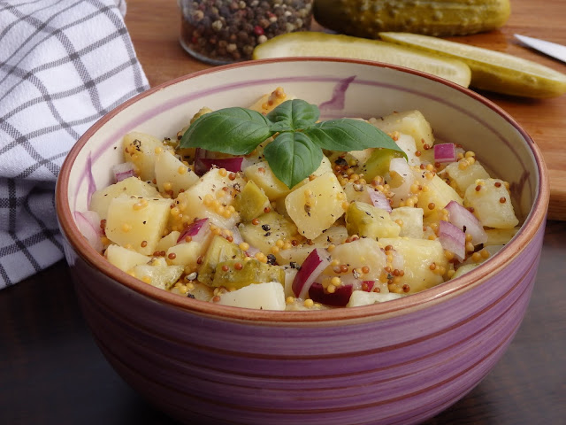 Ziemniak w towarzystwie ogórka małosolnego to pyszny zestaw do obiadu lub grilla. Dwa składniki połączyła musztarda francuska oraz olej. Zamiast oleju można także dodać majonezu.