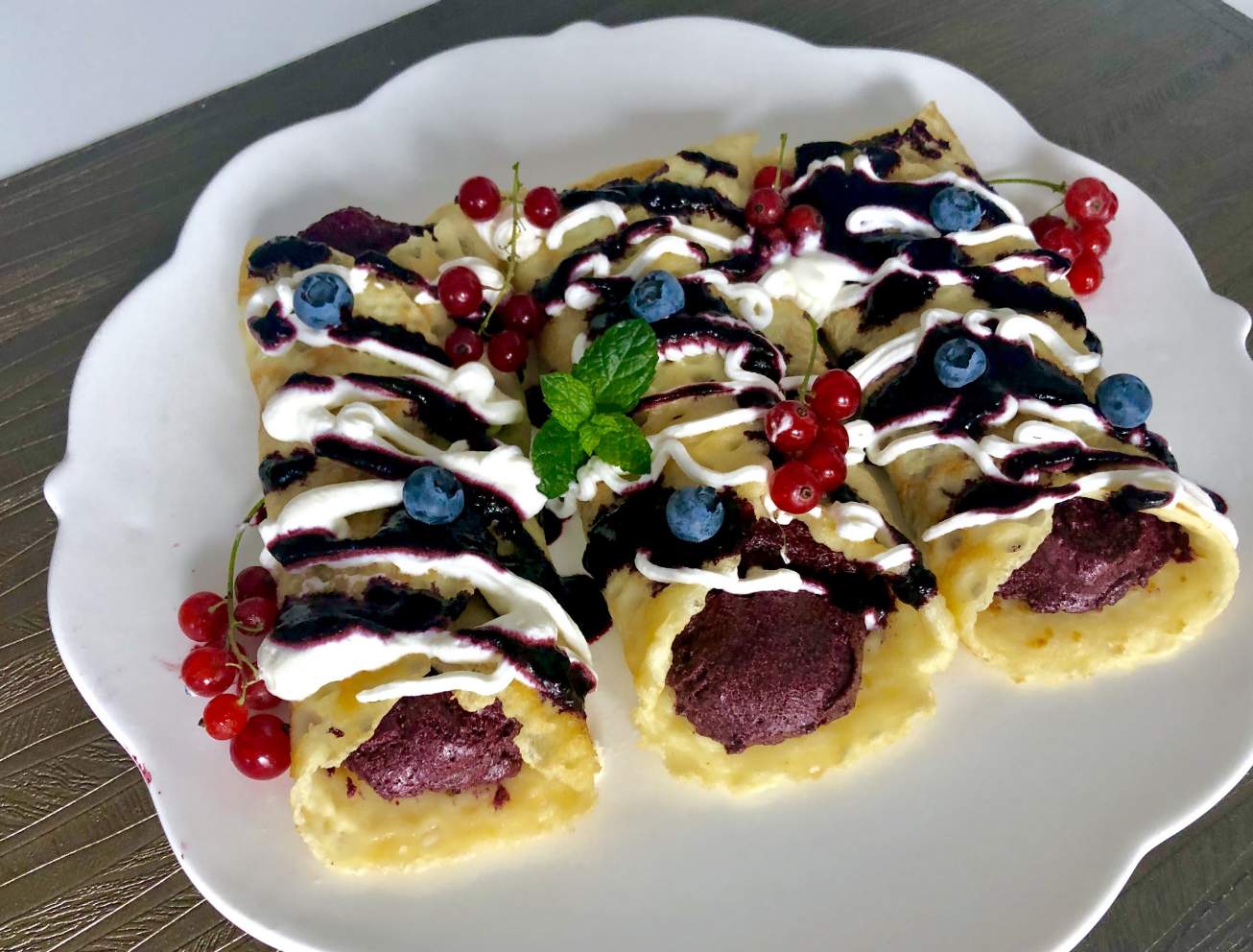 Naleśniki z kremowym musem jagodowym Deserowe naleśniczki ze śmietanką, serkiem mascarpone i…