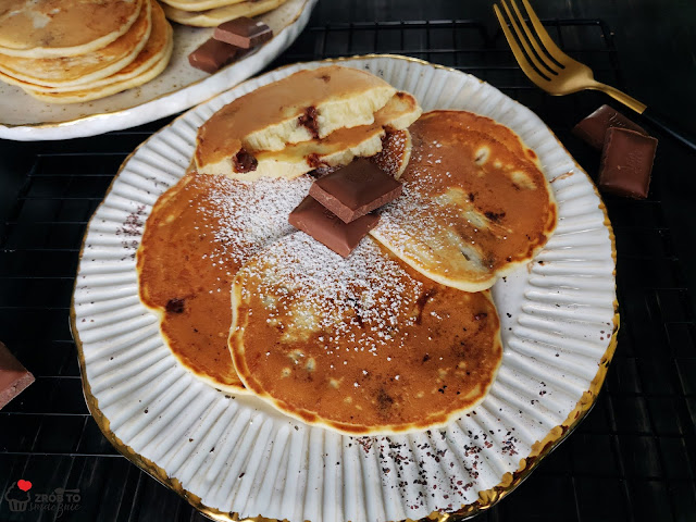 Placki śniadaniowe z czekoladą smakują obłędnie. Doskonałe na śniadanie, drugie śniadanie albo podwieczorek. Moja córka lubi je zabrać w pudełko, kiedy wybieramy się na spacer lub piknik. Są tak smaczne, że nie potrzeba już do nich niczego, można je zwyczajnie chwycić w rękę i zajadać 😉 Szybkie w przygotowaniu, wystarczy