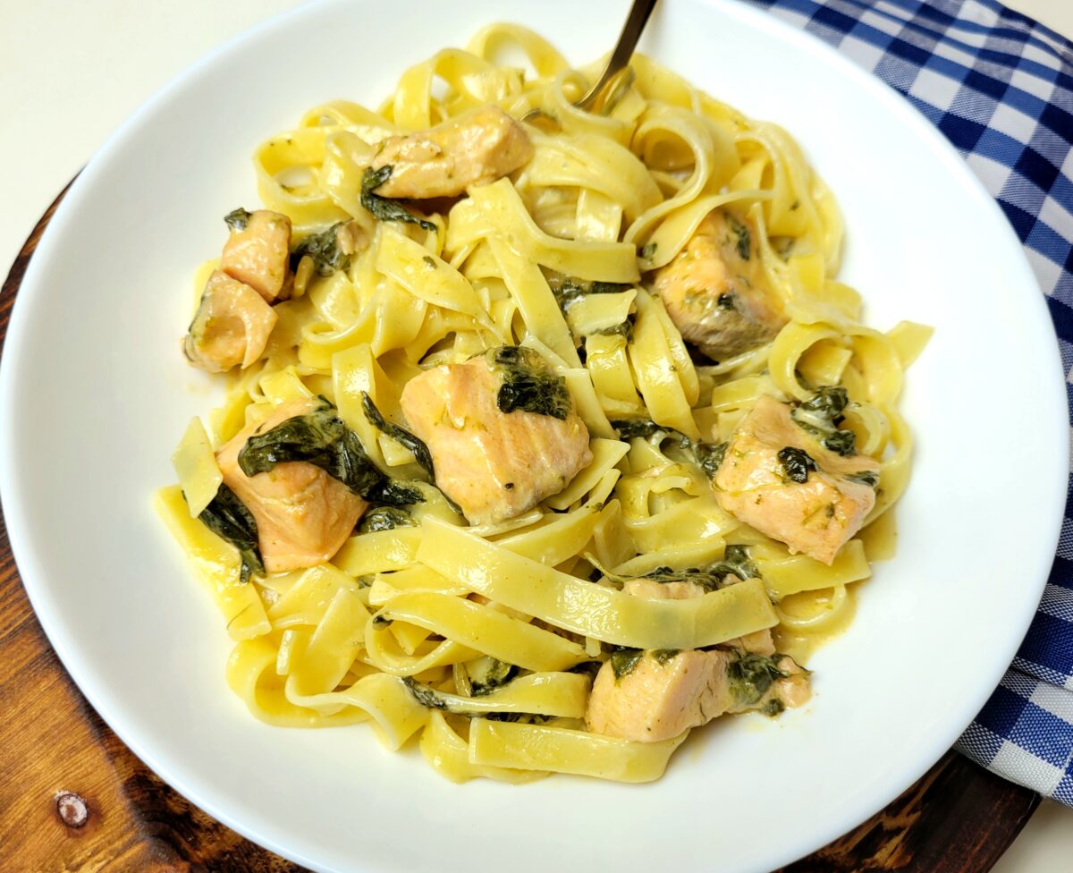 Łosoś w kremowym sosie z dodatkiem szpinaku podany z makaronem to pyszny…