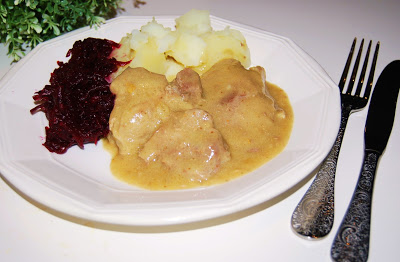 Taki obiad dzisiaj podałam. Ziemniaki z wody, łopatka duszona w sosie musztardowym…