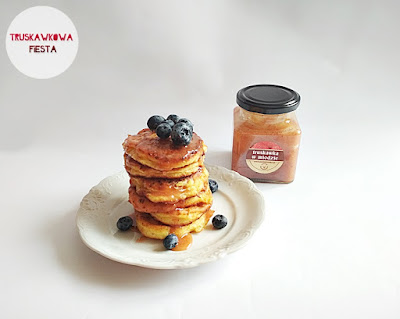 2 jaja10 tabletek słodziku50g mąki z ciecierzycy125g riccotty1/4 łyżeczki proszku do pieczeniaaromat20ml oleju rzepakowego do smażenia20g truskawki w miodzie