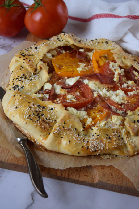 To już kolejna odsłona wytrawnej tarty, kolejna też z użyciem pomidorów. Jednak każda z prezentowanych przeze mnie pomysłów na tarty z pomidorami ma w sobie coś pysznie innego. W tej jest to słona feta, utarta z kremowym serkiem i ziołami, tworzy przepyszną podstawę dla dojrzałych i soczystych pomidorów.