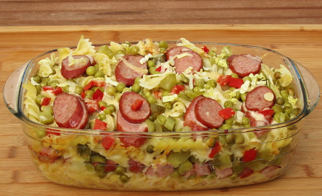 Propozycja na smaczny obiad lub kolację, zapiekanka z kiełbasą.Danie, które wystarczy włożyć…